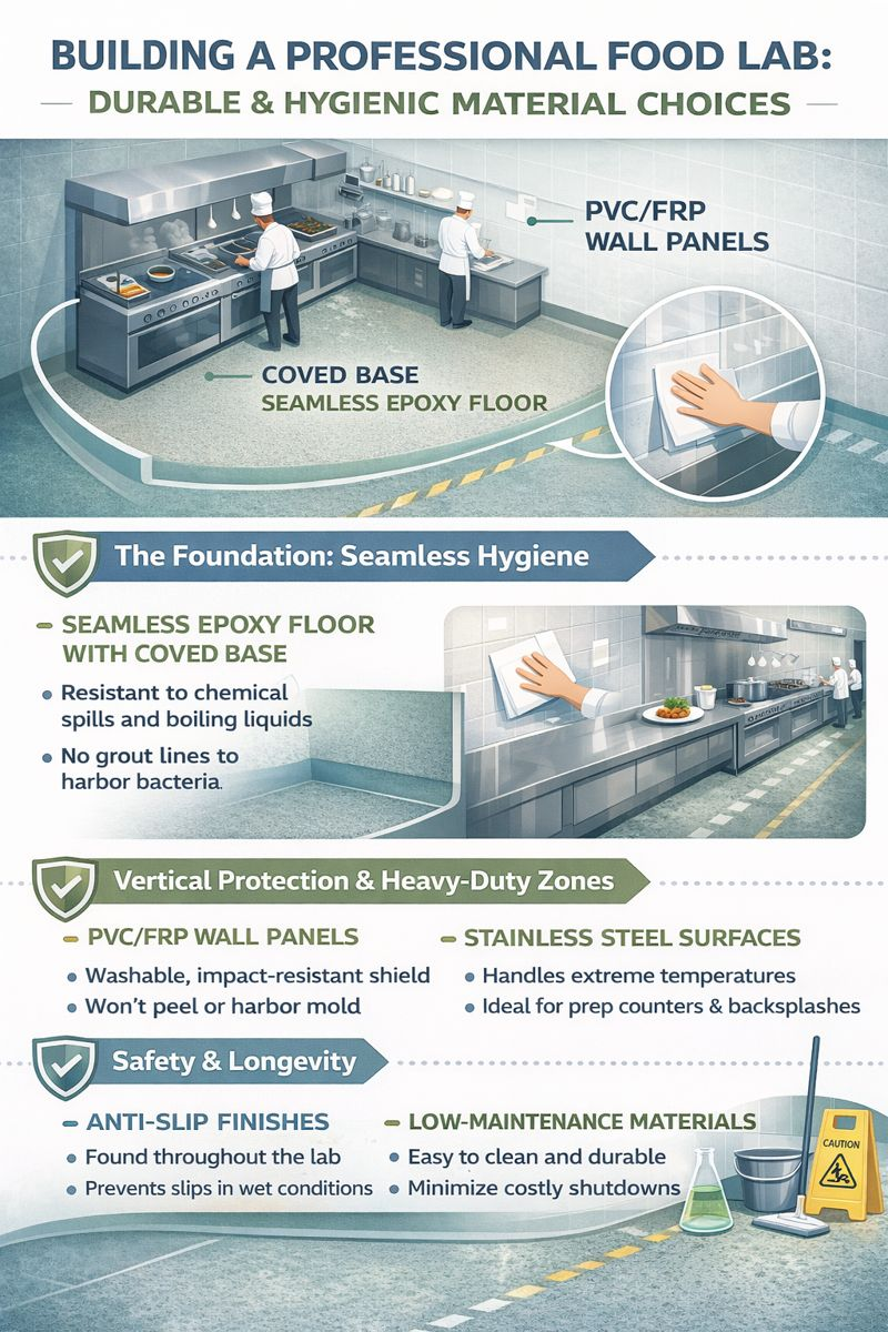 Food labs operate like hybrid environments—part commercial kitchen, part laboratory. Material selection is therefore about performance, not decoration: